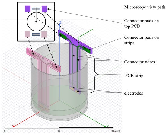Each standard well has a diameter of 16 mm and a depth of 16 mm. Two electrodes are fabricated at the end of a 16 mm strip, enabling the electrodes to reach the bottom of the well. Each electrode has a gold-plated surface area of 1.25 mm × 0.5 mm that is in contact with the bottom of the well. The two electrodes on one strip are separated by 1 mm of insulation. The total width of each strip is 3.5 mm. A circular view path 10 mm in diameter was made between the four electrodes. This allows for viewing the contents of the well under a microscope while the electrode setup is in place. The electrode strips are shown in Figure 5b, and the microscope view path is shown in Figure 5c. The complete setup is shown in Figure 6.
