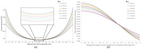 The electric field distribution was analyzed for different equipotential planes from the bottom of the culture well, as shown in Figure 4b. The bottom of the well, where the epidermal cells are modeled, is depicted as a plane at 0 mm. The electric field is observed at equipotential planes from 0 mm to 4.00 mm at intervals of 0.25 mm. The field distribution depends on the current injected through the source electrode. By keeping the injecting current and width of electrodes unchanged, the height of the electrodes () was increased from 0.5 mm to 2.00 mm.