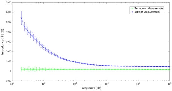 The impedance measurements of the two configurations are shown in Figure 7. The measurements were averaged over the values taken from five culture wells (separately) in the 24-well setup. It shows that the impedance values in the tetrapolar configuration are lower than those of the bipolar configuration. This is in agreement with the known theory, as tetrapolar measurements determine the transfer impedance rather than the actual impedance. The bipolar configuration shows deviations in the low-frequency end, although it poses a rather constant value at higher frequencies. Both configurations show little to no deviation at higher frequencies. It can be concluded that the multi-electrode system does not show notable artifacts due to the hardware configuration over a wide range of frequencies in the controlled laboratory environment, and it can be successfully implemented in bioimpedance measurement applications.