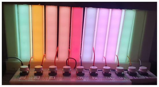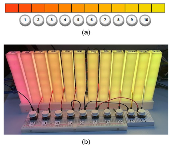 Meanwhile, the physical color perception test was carried out using the proposed data inspection, using 12 3D-printed bars, with LED strips embedded in each physicalization bar. Each bar has a 10 cm height, 17 cm width, and 2 mm thickness front face. These strips encode the colors of each scenario, and each scenario is generated and presented in a random order. These colors of the scenarios are randomized to ensure that there is no bias in the selected order, and to ensure that a unique sample for all participants could not hinder the results in both scenarios, the physical and digital. Figure 7 shows the physicalization created with the color scenarios adapted from the FM test. As in the digital version, the buttons are used to support the task of sorting the colors; with each interaction with each pair of buttons, two colors swaps positions.
