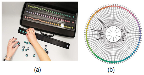 Application of the Farnsworth-Munsell test (a); Polar Chart showing the total number of errors in the ordering test (b). Section (a) is allowed under CC BY-SA 4.0 Deed, 2019, Image and License, Section (b) is adapted, allowed under CC BY-SA 4.0 Deed, 2021 [33]. We focused on the chart.