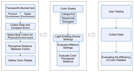 Figure 4 shows the development of the method for evaluating and selecting dynamic colors in the context of physicalizing active data. This starts with the application of the FM test (physical and digital environment), collecting the data and comparing the errors obtained in the digital and physical environment, analyzing and comparing the results obtained, selecting the best colors for the physical environment, calculating the perceptual distance between the colors in order to manually or automatically define the color palettes, defining the color palettes, defining the best configuration for the data physicalization light-emitting device, and applying the user test.