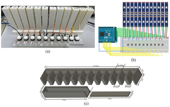 Physical artifact with interaction buttons (a); electronic components connected to an Arduino Mega board (b); 10 cm height bar and 2 mm thickness front face of the bar (c).