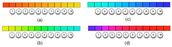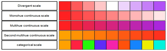Evaluating the errors from all the tests, we selected 70 colors, while 26 colors were considered unsuitable for creating the color scales. In regard to the colors selected, there is significant emphasis on warm colors, and the entire line 3 (of blue hues) was not considered suitable for use on a continuous scale. This confirms the findings of many resources in the literature that human vision favors warm colors [61,62].