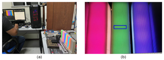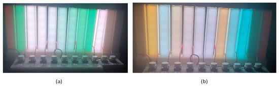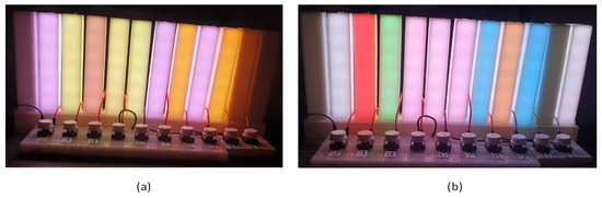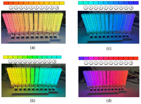 This article used some color spaces, among which the following stand out: RGB, HSV or HSL, CIELAB, and Munsell. RGB is widely used in the display of electronic devices. In this article, it is used in the LED strip configuration embedded in the data physicalization and in estimating the RGB color visible in the data physicalization via a webcam. The HSV and HSL color systems are an alternative to RGB as they come closer to how humans describe the perception of color [23]. In this article, they are used to present the results of color choice and the color palettes proposed. Another system used is CIELAB, a color space widely used to evaluate colors, and it correlates color values with visual perception very well [24]. This article uses the color parameters in CIELAB to calculate the perceptual distance between two colors and estimate their similarity [25]. Finally, the Munsell color space specifies a color in hue (basic color), value (lightness), and chroma (color intensity) and presents a wide chromatic and tonal variety of colors. In this article, the Munsell color system is used to apply the Farnsworth–Munsell test [26], both in digital and physical environments, pointing out potential colors to compose the data physicalization color palettes.
