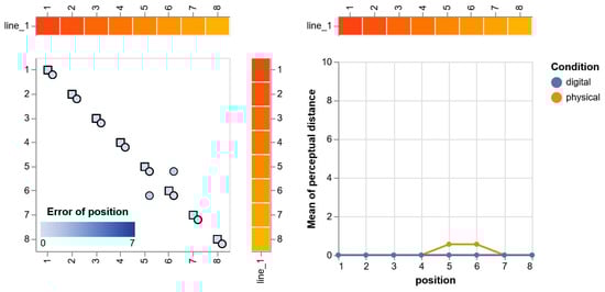 Chart showing the wrong positions in the color order. The image shows the color set of row 1 with 8 colors. In the left chart, the blue shade encodes the sum of the sorting errors, and the x and y axes indicate the positions that the colors should be in and which position was found. The circles and squares indicate the positions in the physical and digital condition. In the right chart, the line chart presents the mean of perceptual errors at each position and condition.