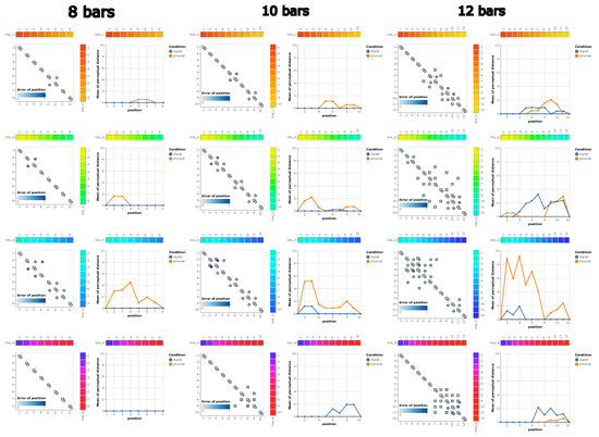 At this stage, the color scales were based on the areas with the smallest errors, given that these errors indicate many restrictions with the neighborhood of colors in the perceptual sense. Figure 8 left shows the representation of the position errors obtained from the color sorting tests, with eight bars, carried out in the digital and physical environments. It should also be noted that the color maps the average of the sorting errors, and the x and y axes indicate the positions that the colors should be in and the position that was found. The circles and squares indicate the positions in the physical and digital condition, respectively. Figure 8 right shows the average number of errors in color sorting, where orange indicates errors in the physical condition and blue indicates errors in the digital color.