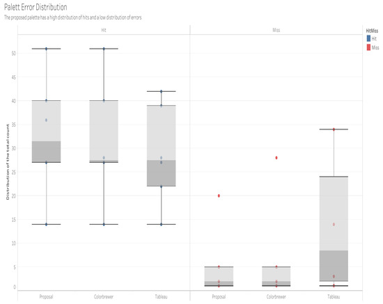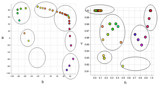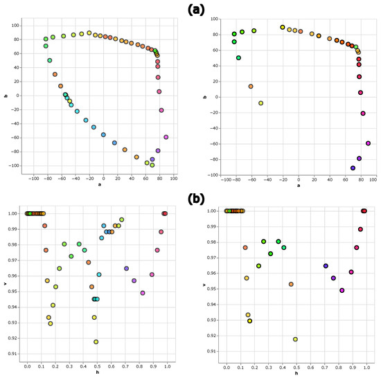 Figure 10a shows the total sets of colors on the CIELAB color space (a and b axes), with the set of all the colors used on the left and the set of colors with the highest hit rate on the right. Figure 10b shows the total sets of colors on the HSV scale (axes h and v), with the set of all the colors on the left and the set of colors with the highest hit rate on the right. The brightness and luminance axes have not been shown for visual clarity.