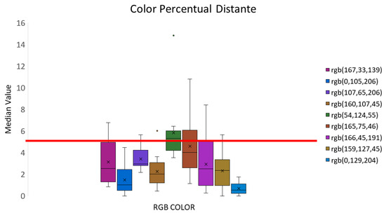 Color tolerance is the metric that describes the limit of the difference between two colors: a reference color and the target color we want to measure its similarity to. Generally speaking, there is no standard for the Color Tolerance Range, which varies depending on the industry or purpose [25]. Therefore, it is possible to imagine that these values for colors in data physicalization will also be different, as it will depend on the material and how the color is proposed in physicalization, among other factors. However, a table of generic values commonly used in the absence of more specific standards can be seen in Table 1. Thus, this article considers that colors are similar if they have perceptual distances between them less than or equal to 5.