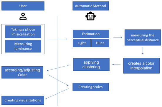 The process starts with the user taking photos and measuring luminance. These are the only inputs to the method. These images must contain a set of colors generated by physicalization to compare with the base colors. Together with these images, the luminance present in the location is estimated.