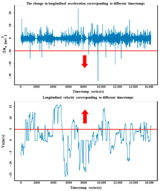 The IMU data (IMU Data is the data collected by IMU sensors) in the KITTI dataset records the vehicle’s motion information at each timestamp, including dimensions, longitude, altitude, roll angle, pitch angle, yaw angle, longitudinal velocity, lateral velocity, x-axis acceleration, y-axis acceleration, and z-axis acceleration. According to the query results, the collection frequency of the KITTI dataset is 10 Hz, that is, the interval between every two timestamps is 0.1 s, from which the acceleration gradient corresponding to each timestamp can be calculated.