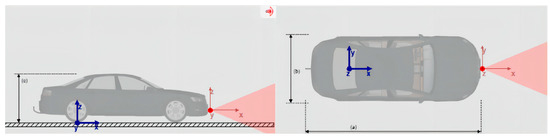 The Audi A8 has been selected as the test vehicle, with the Tesla Model 3 serving as the lead vehicle. To simulate millimeter-wave radar or lidar, two TIS sensors have been employed, with TIS1 designated for long-range sensing and TIS2 for blind-spot sensing. The coordinate origin is depicted in Figure 6, while Table 3 outlines the sensor positions, scanning methods, scanning frequencies, sensing ranges, sensing angles, and other pertinent parameters.