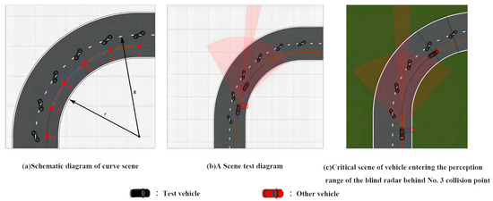 According to Chinese highway standards [29], the radius of a road is 30 m, and the width of a single lane is 3.75 m. We will construct a one-way two-lane road in PRESCAN, as shown in the Figure 7, with R = 33.75 m and r = 30 m. We will divide the 90-degree curve into five segments, with each segment having a curvature of 18 degrees, and set collision points 1, 2, 3, 4, and 5.