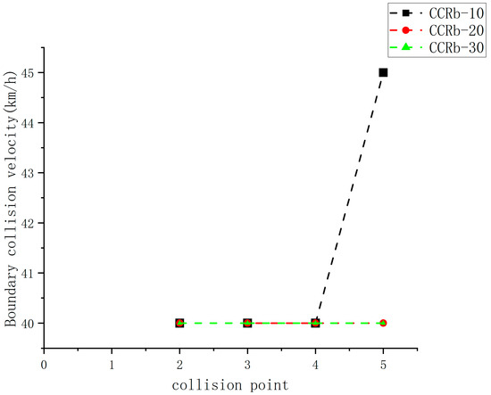 Since this AEB system is designed based on the TTC (Time-to-Collision) principle, the most important factors affecting the system’s response are the speeds of the lead and test vehicles. Therefore, we can use the difference between the test vehicle’s boundary speed and the lead vehicle’s slow-moving speed to measure the system’s response boundary. Based on safety principles, we will take the minimum value of the five collision points as the boundary collision speed for safety. The safety boundary collision speeds for the 10 km/h, 20 km/h, and 30 km/h scenarios are 35 km/h, 25 km/h, and 40 km/h, respectively. Therefore, the range of the AEB system’s safety boundary collision speed for the curved road in this scenario is 25–40 km/h. Based on safety principles, the maximum safety boundary collision speed for the AEB system in this scenario is the minimum value, which is 25 km/h.