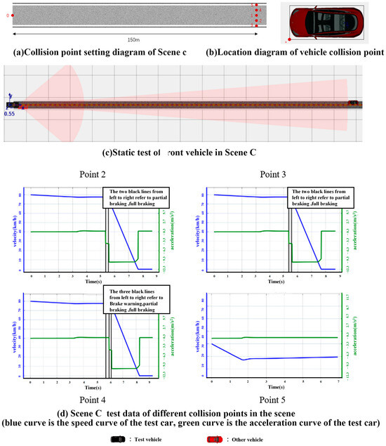 Referring to the CN-CAP testing specifications, as the obstacle vehicle is stationary on the roadside in this scenario, the test case is set as preceding vehicle static. The speed range of the ego vehicle is set to 5–80 km/h, and the preceding vehicle is placed at points 1, 2, 3, 4, and 5. Point 1 is the same as in scenario B, where the preceding vehicle is static. Therefore, this scenario mainly evaluates the experimental effect when the obstacle vehicle is offset, i.e., at collision points 2, 3, 4, and 5.