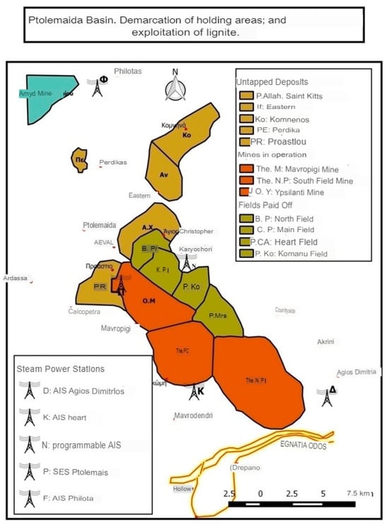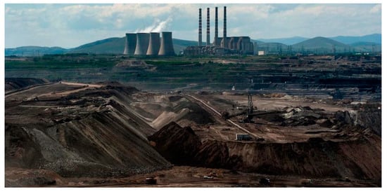 Lignite is one of Greece’s most valuable mineral resources used for electric power production. Greek lignite reserves are in terrestrial or xylitic deposits and occur mainly in the western part of the country (Region of Western Macedonia, Greece). According to the Public Power Corporation (PPC), the original resources have been estimated at 5 billion tons. The Region of Western Macedonia and, in particular, the areas of Ptolemaida, Amynteo, and Florina have the largest lignite capacity in Greece, with total deposits of 1.9 billion tons [25]. In the Ptolemaida basin, a total of eight lignite deposits have been recorded, with three lignite mines (south field mine, Ypsilanti or southwest mine, and Mavropigi mine; Figure 1) near the Ptolemaida power station (Figure 2), which is a 1210-megawatt coal-fired power station with five units [26]. Considering that the Greek plan to stop burning lignite to produce energy according to the “Just Transition Development Plan 2021-27” of Western Macedonia, this has not yet been seen [27,28]; the recovery of an exploitable energy source from its lignite deposits will accelerate the forthcoming exit from the era of coal use. Thus, the beneficial exploitation of lignite deposits could reduce the climate change impact through the mitigation of GHG sources [29]. However, the unconventional hydrocarbon potential resources, i.e., LCBM, of the country are not well known, since detailed investigations are lacking.