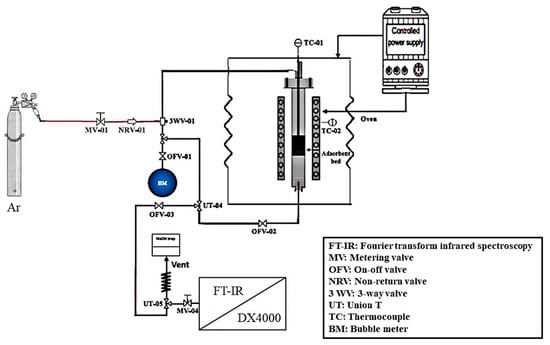 Desorption tests were conducted under low and high temperatures to investigate the methane desorption from lignite in order to evaluate temperature effects on gas desorption [36,37]. The desorption process of the three lignite samples from the southern field of the Ptolemaida basin was evaluated at four different temperatures: 25 °C, 50 °C, 100 °C, and 150 °C at standard atmospheric pressure (1 atm). The pressure of the desorption process is equal to the atmospheric pressure because, at these temperatures, any increase in pressure could cause the ignition of the methane produced. The desorption tests were performed using a fixed-bed quartz reactor with an internal diameter of 0.9 cm and a total height of 40 cm, under ambient pressure. A schematic representation of the equipment used is given in Figure 5. For the desorption experiments, 3.0 g (dry weight) of each lignite sample was used to fill the reactor up to a height of 7.1 cm. The bed of the packaging material (called desorbent bed) was supported on both sides of the reactor by inert quartz. The bed geometry (height/diameter) was 7.88. The temperature of the reactor was measured by a type K thermocouple located in its center. The temperature of the reactor furnace could reach a wide range of operating temperatures (up to 800 °C) and was monitored by a type K thermocouple.