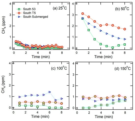 Methane quantity in ppm desorbed from 3 g sample during desorption experiments at (a) 25 °C, (b) 50 °C, (c) 100 °C, and (d) 150 °C.
