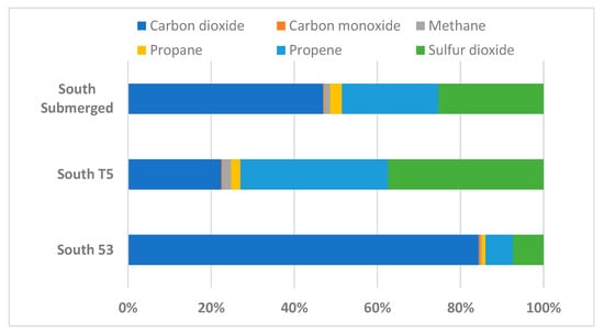 Figure 7 shows the composition analysis of the produced gas at desorption conditions of 50 °C for the three tested samples. It was observed that the CO2 content by volume dominates in a higher extent to the gas content of the South 53 (84%) and of the South Submerged (47%) samples, as compared to the gas content of the South T5 sample (24%). The South T5 sample was proved to have a higher CH4 content by volume (2%) as compared to the South 53 and the South Submerged samples. Moreover, the volume percentage of heavier hydrocarbons (propane and propene) of the South T5 sample was about 38%, which is higher than the 7.5% and the 26% in the South Submerged and South 53 samples, respectively.