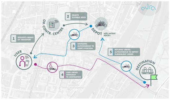 Figure 1 shows the conceptual OSABS workflow. Initially, the user requests an autonomous driving cargo bike (ADCB) via a smartphone app. As a next step, the Operation Control Center (OCC) selects a suitable bike which will then autonomously drive to the user’s location. After the bike arrives, the user manually rides it to a desired location. At the destination, the user releases the bike and it autonomously drives to the next customer or to a waiting or charging station (e.g., Refs. [16,17,18]).