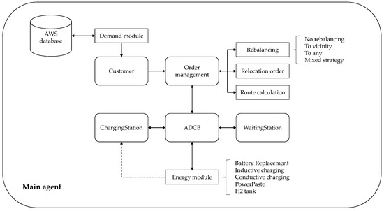 Customer agent: The “createusers()” function from the Main agent populates Customer agents based on the demand data into the simulation environment. While entering the system, a Customer agent creates an order request for an ADCB. The request is forwarded to the Order management module.