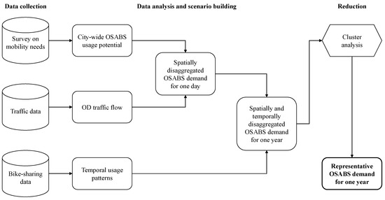 In order to explore its potential for sustainable urban mobility and provide a better understanding of the novel system, we evaluate different strategies (order management, station distribution, and rebalancing) and energy supply technologies using an agent-based simulation model [17,18]. Next to various business cases, demand scenarios that predict the hourly use of OSABS for a one-year period are a key input for the simulation model. However, due to the novelty of OSABS, there is currently no information about its utilization. Within this paper, we therefore provide a data-driven approach that aims at modeling different demand scenarios for OSABS in a temporally and spatially disaggregated manner.