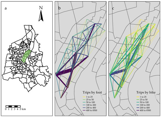 Within the framework of our case study, we used travel demand matrices provided by the municipality of Magdeburg. They contain trips for four different modes of transport, including foot, bike, car, and public transport, for a time period of one day. The matrices are structured in a way that the rows contain all trips generated from each origin and the columns contain all trips attracted from each destination. Therefore, they are often referred to as origin–destination matrices (OD-matrices). Within the matrices, a total of 182 districts evenly distributed throughout the city of Magdeburg serve as origins and destinations. In order to access the geographic location and geometry information of those districts, we used an ESRI shapefile which was also provided by the municipality of Magdeburg. A map of the city of Magdeburg as well as its districts is shown in Figure 5a. Additionally, the inner-city OD-flows for the transport modes foot and bike are shown in Figure 5b and Figure 5c, respectively.