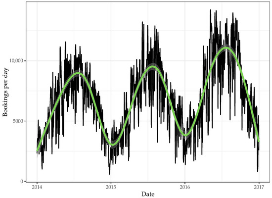For deriving temporal patterns, i.e., systematic variations in daily, weekly, and yearly profiles, we aggregated the conventional bike sharing demand data using one-hour intervals. Since the resulting data were typical count data, i.e., observations containing only non-negative integer values [68], we then applied count models based on generalized linear models (GLMs) to retrieve the impact of certain time-related influencing variables on the observed hourly bookings (see [68,69]).
