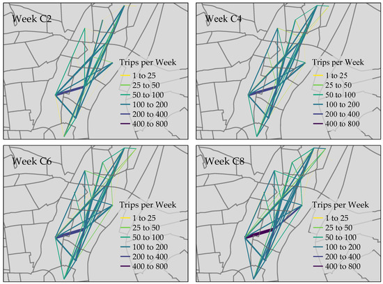 Since most of the calculated traffic flows were non-integer values, it was then necessary to apply an algorithm that allows for rounding the results to integer values while preserving their overall sum. To achieve this, after rounding every number down in the first step, we incrementally rounded up those numbers with the highest fractional parts until the desired sum was reached. The total OSABS demand for a statistical traffic day is 8322 trips for the high scenario and 5435 trips for the low scenario.
