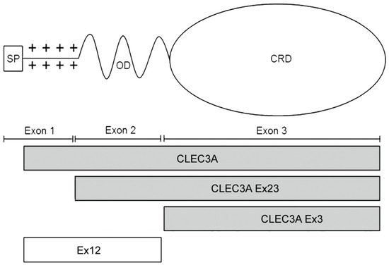 Schematic illustration of human CLEC3A. CLEC3A consists of a signal-peptide (SP) and a cationic sequence encoded by exon 1, an oligomerization domain (OD) encoded by exon 2, and a carbohydrate recognition domain (CRD) encoded by exon 3. Boxes shaded in grey represent CLEC3A and the CLEC3A protein domains CLEC3A Ex23 and CLEC3A Ex3. Ex12 is a CLEC3A-derived antimirobial peptide and is encoded by exon 1 and exon 2. Adapted from Elezagic et al., 2019 [15].
