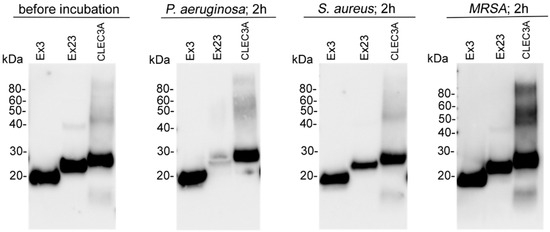 Degradation of CLEC3A can lead to the generation of CLEC3A-derived AMPs [15]. Therefore, we investigated whether the antimicrobial activity of CLEC3A, CLEC3A Ex23, and CLEC3A Ex3 was caused by bacterial cleavage and generation of CLEC3A-derived AMPs during the 2-h incubation period of the viable count assay. For CLEC3A and CLEC3A Ex3, we did not observe bacterial cleavage after incubation with P. aeruginosa, S. aureus, or MRSA, thus we can exclude an association between degradation and antimicrobial activity. In contrast, we observed a cleavage of CLEC3A Ex23 when incubated with P. aeruginosa and S. aureus (Figure 4). We did not detect any additional bands with a lower weight, making it unlikely that the antimicrobial effect of CLEC3A Ex23 against P. aeruginosa or S. aureus was due to the generation of CLEC3A-derived AMPs. Nevertheless, we cannot entirely rule out this possibility.