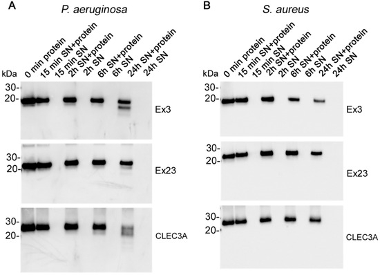 Incubation of CLEC3A Ex3, CLEC3A Ex23, and CLEC3A with supernatants of P. aeruginosa (A) and S. aureus (B) for different time periods. Representative immunoblots showing 1 µg CLEC3A Ex3 (Ex3), CLEC3A Ex23 (Ex23), and CLEC3A in water and after 15 min, 2 h, 6 h, and 24 h of incubation with bacterial supernatant (SN + protein) of the respective bacterial strains. Proteins were detected by using an anti-human CLEC3A antibody. Bacterial supernatant without protein (SN) is shown as a control at each time point. Full-sized immunoblots and secondary antibody-only controls are shown in Supplementary Figure S4. Immunoblots were performed three times for each bacterial strain.
