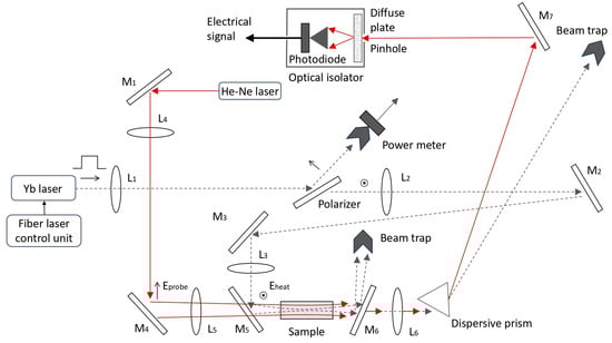 The optical part of the TPCI scheme. L1, L2, and L3 are lenses projecting (with the required scale) into the center of the sample a Gaussian–like transverse field distribution at the output of a heating ytterbium laser operating in pulse-periodic regime; L4 and L5 are lenses projecting (with the required scale) into the center of the sample a Gaussian–like transverse field distribution in the far zone of a probe helium–neon laser (λ = 633 nm), L6 is a lens projecting (with the required scale) the transverse distribution of the probe beam field onto the diaphragm (this distribution is selected in the cross section where the amplitude of the time-varying component of the probe radiation power is maximum); mirrors M2, M3, M5, and M6 have a reflection coefficient R1071 ≈ 100% at a wavelength of 1071 nm, mirrors M1, M4, and M7 have a reflection coefficient R633 ≈ 100% at a wavelength of 633 nm, and mirrors M4 and M7 have a reflection coefficient R633 ≈ 0% at a wavelength of 633 nm; Eheat and Eprobe are the fields of the heating and probe beams, respectively. Mirror M7 has a selective function, also due to the cutting of heating radiation by its edge. In this case, the heating radiation is absorbed into the beam trap and is not incident on the photodiode diaphragm. The directions of the heating (gray) and probe (red) beams are shown by arrows, and their waists are schematically shown in the sample area.
