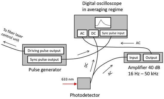 As before [17,20,21,22], a single-mode fiber ytterbium laser (λ = 1071 nm, M2 = 1.08) operating in a pulse-periodic regime was used as a heating laser, and a continuous-wave single-mode He-Ne laser (λ = 633 nm) with an output power of 2 mW was employed as a probe laser. Figure 2 shows a block diagram of the electronic part of the setup. The driving pulse generator set the repetition rate as well as the duration of the heating laser pulse, which varied from 100 μs to 1000 μs in the experiment. The pulse repetition rate ranged from 10 Hz to 30 Hz. The output energy of the heating laser radiation pulse varied from 1 to 40 mJ due to the laser control unit. The radiation pulse had a quasi-rectangular temporal shape, the structure of the leading edge of which, with a duration of about 7 μs, was determined by the process of the build-up of the stationary generation of a fiber laser. The duration of the trailing edge, measured using a fast diode and a broadband oscilloscope, was ≈10−8 s.