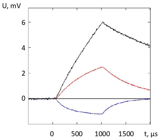 To conclude, we note that for quartz glasses, with a further increase in the duration of the heating pulse from 1 ms to 5 ms, which corresponds to the relation , the amplitude of the time-varying component shown in black in Figure 5 increases by about three times and will be 18 mV while maintaining the noise component level (≈15 µV). Accordingly, the measurement sensitivity (the signal-to-noise ratio is 1) in this configuration of the experimental scheme will be 2 × 10−9 cm−1. Measuring absorption at such a low level can find application in the problem of determining the concentration of impurities in ultrapure quartz glasses.