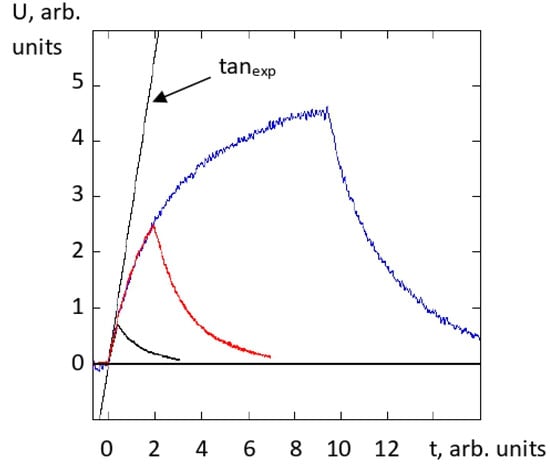 The calculation of the correction factor for theoretically obtained oscillograms was similar to the above calculation for oscillograms obtained in the experiment. First, waveforms of the time-varying component were constructed for the Suprasil 311 UQG calibration sample and the SCQ sample for two cases, namely, under conditions of developed heat diffusion and in its absence. In the second case, the amplitude of the time-varying component increases linearly with time. Its diagram coincides with the tangent to the functional dependence, describing the shape of the time-varying component at the moment the heating pulse starts. Further, the ratios of the maxima of the calculated signals, namely, 2.36 and 1.25 for SCQ and Suprasil 311, respectively, were obtained. The resulting correction factor for SCQ was calculated as kdiff = 2.36/1.25 = 1.73. Note that, despite the difference in the slopes of the theoretical and experimental tangents (Figure 5a) due to the notable difference between the leading edge of the heating pulse and the rectangular one, the calculated and measured coefficients almost coincide. Such an exact coincidence is accidental due to the ambiguity in constructing tangents to the experimental curves, mentioned in Section 2.