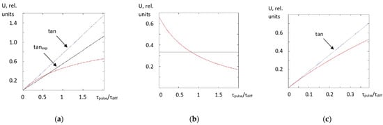 Calculated forms of temporal dependences of signals U(t) of the time-varying component of the probe radiation power (red line) in the interval of exposure to a heating pulse of 1 ms duration in the TPCI scheme (time t is normalized to the characteristic time of heat diffusion τdiff) for (a) SCQ and (c) UQG samples; (b) typical waveform after the end of the heating pulse upon cooling of the UQG sample due to heat diffusion (the start of the decay is reckoned from 0; the transverse line corresponds to the half-maximum level), “tan” are the tangents at the point where the pulses start, and “tanexp” is the corresponding experimental tangent [22].