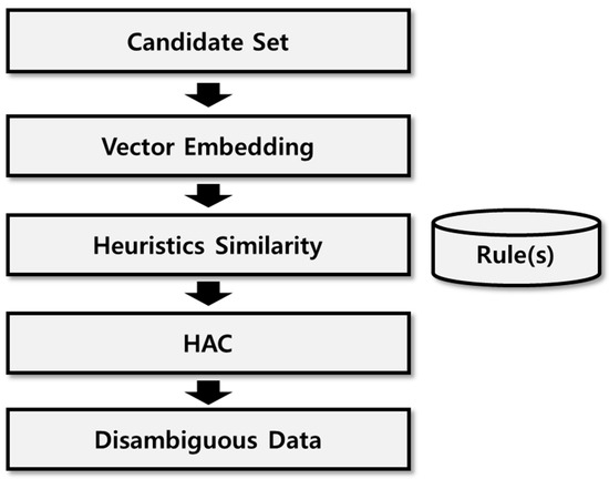 In [7], a rule-based name disambiguation scheme was proposed. Figure 1 shows the flow chart of the rule-based name disambiguation scheme. When candidates with the same name input, a document vector is created based on the articles written by the candidates. Then, the rule-based heuristic similarity scores are calculated. Finally, they perform a clustering method, such as HAC, based on the similarity scores. Finally, they obtain dis-ambiguous data by generating clusters with the same authors. The collected data were preprocessed based on established rules. The preprocessed data were then subjected to name disambiguation using one of the two schemes: the rule-based name disambiguation method or a classifier-based method. After collecting documents from the database, attributes, such as surname, first name, co-authors, affiliation, research field, and keywords, were extracted for the name disambiguation scheme. The surname extracted during the preprocessing stage was used as is, while the initial of the first name was included in a data block, along with the attributes. Rule-based similarity was calculated on a block-by-block basis, and hierarchical agglomerative clustering (HAC) was performed based on the calculated similarity. HAC merges the most similar clusters together, starting with each data point as a separate cluster. HAC is most suitable in the author name disambiguation studies. For example, k-means clustering requires the number of cluster k. This is not suitable because the exact number of authors with the same name is unknown. The “similarity estimated by classifiers” method performed clustering based on similarity scores generated by classifiers and extracted stems from paper titles, abstracts, and keywords. For the extracted stems, similarity was calculated using the term frequency-inverse document frequency (TF-IDF) and latent semantic analysis models. The classifiers were trained using the information from data blocks. HAC was performed based on the similarity scores generated by the classifier. Name disambiguation was performed based on the results of the HAC.