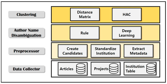 Figure 3 presents the overall system architecture of the proposed scheme. The collector gathers research papers, project data, and affiliation information for research outcomes from academic search services. The preprocessor creates a set of name-ambiguity candidates with identical names, considered as subjects in this study, from all the documents collected by the collector. The collected affiliation information is transformed into a standardized form using an affiliation table. Attributes to be used for name disambiguation are then extracted. In the analyzer, the preprocessed attribute data are used to analyze the similarity between all documents of the name-ambiguity candidate group using both the rule-based and deep learning schemes. The analyzer performs calculation simultaneously for the rule-based candidate group similarity and the deep learning-based candidate group similarity. Finally, in the discriminator, the analyzed document similarity data are represented as a distance matrix by using sim2diss function for clustering execution, and HAC is performed to divide the clusters by unique author documents and to disambiguate names.
