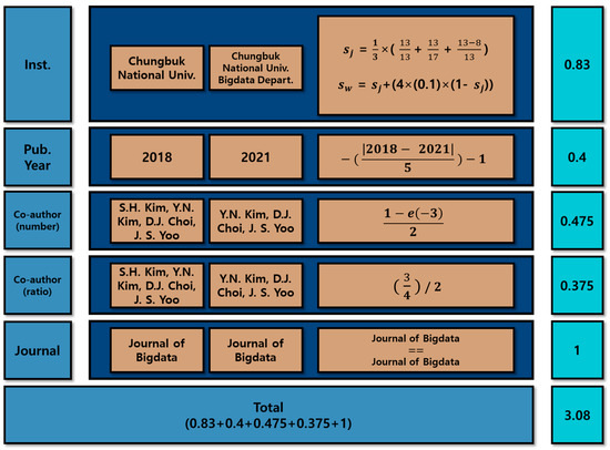 Figure 4 shows an example of weight determination based on the rules listed in Table 3. For the affiliation attribute, the Jaro–Winkler distance value was derived from the redundant words “Chungbuk National Univ.” and “Chungbuk National Univ. Bigdata Depart”, resulting in the sj value. In the Jaro–Winkler similarity, m denotes the number of common characters in the two strings. In the above example, all the letters of s1 are common. m is calculated as 21. Therefore, the sj value is 0.7. To calculate sw, the common prefix length w is set to 4 (maximum value), and p is calculated as a standard value of 0.1. As a result, sw is 0.83. The publication year attribute defines the data collection period as 5 years. By using the absolute value function to calculate the publication year difference between the two documents, a score of 0.4 was assigned. The co-author attribute determines the number of identical co-authors in the two papers, excluding the co-author with the same name, “Jang Jun-hyuk”. The co-author ratio divides the number of co-authors by the number of co-authors in the document with the larger number of co-authors. If we evaluate only the number of co-authors in a paper written by one author, we get an ambiguous value of approximately 0.63. This value is a very uncertain number to perform an analysis with the same name. In addition, if the number of co-authors of the same name accidentally increases in a paper with a large number of authors, the value of the number of co-authors converges to 1. To solve this problem, we supplemented this by adding a co-authors ratio. Here, the combined values of the co-author count and ratio were halved, and scores of 0.475 and 0.375, respectively, were obtained. Thus, the co-author attribute value was represented as 0.85. For the journal and conference attributes, since conferences of both the documents were “Journal of Bigdata”, they were identical, and a score of one was assigned. By adding the results from all the rules, the final weight was determined. The weight of the sample documents “Jang_0” and “Jang_1” was 3.08, indicating a high similarity.