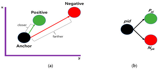 Deep learning analysis uses various attributes, such as the title, keywords, abstract, co-authors, publication year, and journal data. As the document title and abstract were used as attributes, major keywords from these attributes were extracted using natural language processing packages, such as konlpy and NLTK. The extracted keywords were then converted into a vector form using FastText. This converted vector was used as the input vector for the deep learning model. In this study, the converted vectors were constructed in the form of a triplet network. The triplet network structure, as shown in Figure 5, represents vectors by placing vectors with similar and dissimilar values close to each other and further apart, respectively. In the (A) triplet network, anchor refers to a document of a unique author, positive refers to another document of that unique author, and negative refers to a document of an author with the same name but not the unique author. With the anchor document as a reference, the objective of the triplet network is to bring the documents corresponding to the positive closer and drive those corresponding to the negative far apart. As shown in Figure 5b, a pid triplet transformed the vector value of the converted paper into an optimal vector value using the vector value of another paper. Initially, Ppj referred to a paper similar to the pid paper (with author, title, publication year, keywords, journal info, etc.), and Npk referred to a paper dissimilar to the pid paper. The aim of the triplet was to calculate the distance between vectors, bringing similar vectors closer and pushing dissimilar vectors further apart. Therefore, based on the similarity in the information of the papers, the vector values of all the input papers were converted into the form of a triplet network, as shown in Figure 5a.