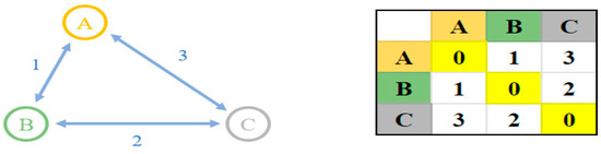 Figure 6 illustrates the method of constructing the similarity matrix using inter-document similarities. The input data A, B, and C have a total of three distance values, and the distances between all pairs, such as A–B and A–C, can be represented as a 3 × 3 matrix. Figure 5a displays a graph containing inter-document similarity values calculated from the name disambiguation analyzer. The distance between input data A and B is represented as one, A and C as three, and B and C as two. Figure 6 presents the similarity matrix in matrix form and shows all distance values from the graph data.