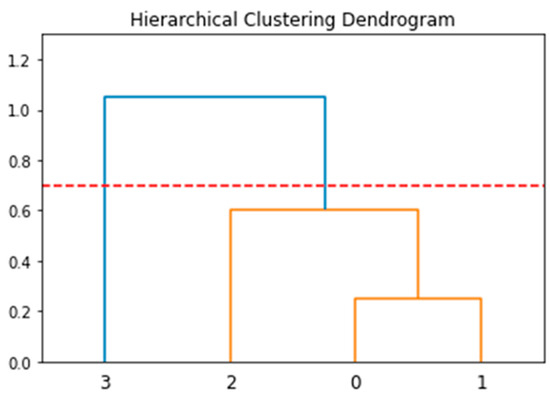 Figure 7 shows an example of a dendrogram, using which the results of the HAC were visualized. Figure 6 shows the grouping of clusters. The red dotted line in the figure represents the stopping criterion, distance_threshold. Clusters grouped by the stopping criterion are marked in orange, while those not grouped are marked in blue. Clusters divided by the stopping criterion indicate individuals with the same name.