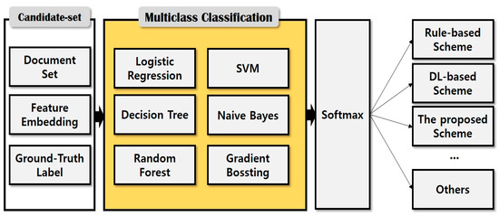 The multi-classifier operated through the following steps. First, we perform the feature embedding. The attributes of candidate documents for name disambiguation are transformed into vector representations via a feature embedding process, such as word2vec, doc2vec, and FastText. Next, we conduct performance evaluations for each name disambiguation schemes by using the transformed feature value. Finally, by comparing the performances, we select the best scheme as the ground truth label for the transformed feature value. We employ the labels to train the proposed multi-classifier. After all the ground truth labels were generated, training was conducted using these data and various existing multi-classifiers. The trained multi-classifier then received input values that were converted to vectors through the feature embedding process of site-specific metadata. Ultimately, the multi-classifier produced the most appropriate identification scheme as its output. Thus, selecting the most suitable name disambiguation scheme in real-world environments becomes possible where various metadata are generated. Furthermore, even when a new identification scheme is introduced, the multi-classifier can be extended by adding one label, enabling the utilization of an expandable multi-classifier model.
