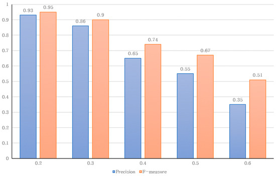 Figure 9 displays the performance evaluation results based on the termination criterion. The results for the precision and F1-measure are represented in a bar graph. Performance evaluation was conducted by changing the termination criterion values from 0.2 to 0.6. The termination criterion of 0.2, which showed the highest F1-measure value of 0.95, was determined to be the most suitable termination criterion. A termination criterion of 0.2 means that if the distance between documents (or clusters) is closer than 0.2, they are clustered, and if not, they are not clustered. Through experimental evaluations, the termination criterion of 0.2 was used as the HAC standard in the proposed scheme.