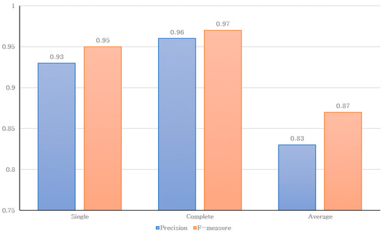 A performance evaluation was conducted based on the linkage method setting, which is one of the hyper-parameters of HAC. In the proposed scheme, when implementing the rule-based name disambiguation method using HAC, the clustering results can vary depending on the linkage method, similarly to that with the termination criterion. Therefore, in this study, an experimental evaluation for each linkage method was conducted as an intrinsic performance evaluation method to determine the optimal linkage method. The termination criterion was set to 0.2, as determined through performance evaluation in the previous step. Figure 10 displays the performance evaluation results based on the linkage method. Three linkage methods were compared: single, complete, and average, excluding Ward’s linkage, which cannot be used in HAC. According to the experimental results, the complete linkage method exhibited a higher F1-measure value than the other two methods. Therefore, the complete linkage method, which yielded the highest scores for precision and F1-measure, was adopted as the linkage method in the proposed scheme.
