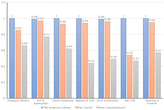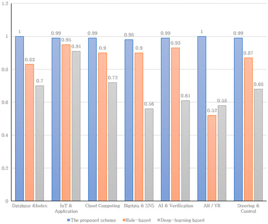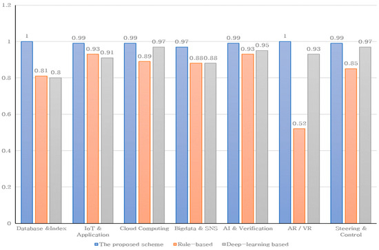 Figure 12 displays the results of the comparative performance evaluation of recall based on the name disambiguation schemes. The recall of the proposed scheme demonstrated a very high performance, with scores >0.97 for all keywords. The existing deep learning-based Chen Ya method showed excellent performance for keywords “cloud computing”, “AI verification”, and “steering control”; however, the proposed method outperformed for all keywords.
