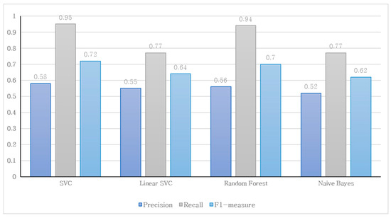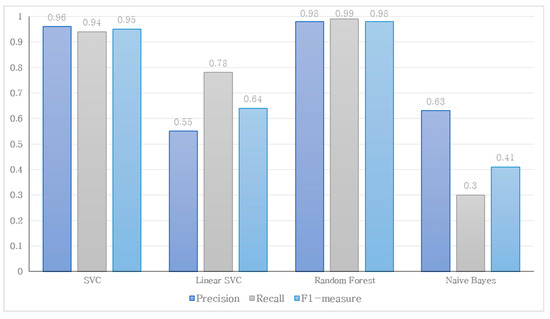 In the performance evaluation of the multi-classifier, the proposed scheme selected either the rule-based or deep learning discrimination method based on attributes using machine learning. The machine-learning models used in the multi-classifier include a total of four classification schemes: support vector classification (SVC), linear SVC, random forest, and naive Bayes. Through the multi-classifier performance evaluation, the most appropriate multi-classifier scheme was determined. To measure the accuracy of the proposed method, performance was evaluated by calculating precision, recall, and F1-measure. The performance evaluations of the classifiers were conducted as follows. First, we test the optimal hyperparameter for each classifier based on exactly the same training set. The training set was designated as 80% of the dataset. After that, the performance evaluation for each keyword was conducted based on the optimized model. For example, the hyperparameters of the SVC model are as follows: C, gamma, and the kernel are derived to be 0.1, 0.001, and rbf, respectively. The alpha value of the naïve Bayse model is set to 1.0.