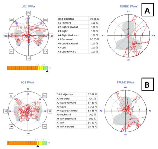 Figure 4 illustrates that the CS group exhibited larger values for limits-of-stability variables and increased trunk sway, while the healthy control group had a higher percentage of achievement (eight directions—A1 to A8) in limits of stability compared with the CS group.