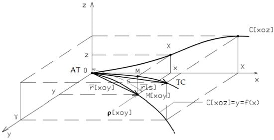 A spatial railway curve is defined by three coordinates: x, y, and z, with z representing the superelevation. The trajectory of a vehicle on a spatial curve is illustrated in Figure 1. The spatial 3D curve, denoted as AT (alignment–transition curve point)–TC (transition curve–circular curve point), projects onto the vertical plane (xoz) to depict the superelevation and onto the horizontal plane (xoy) to represent the x and y coordinates, where y is a function of x. The trajectory of the railway axis is denoted as r, and the curvature is expressed as ρ.